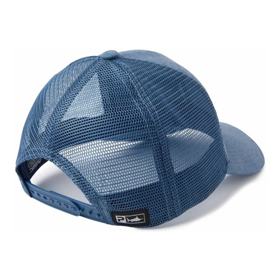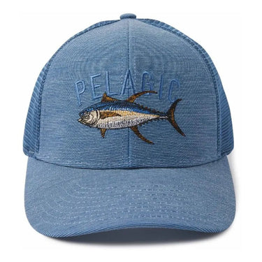Trucker hat featuring a front embroidered Tuna graphic. Custom game fish logo with side embroidery.