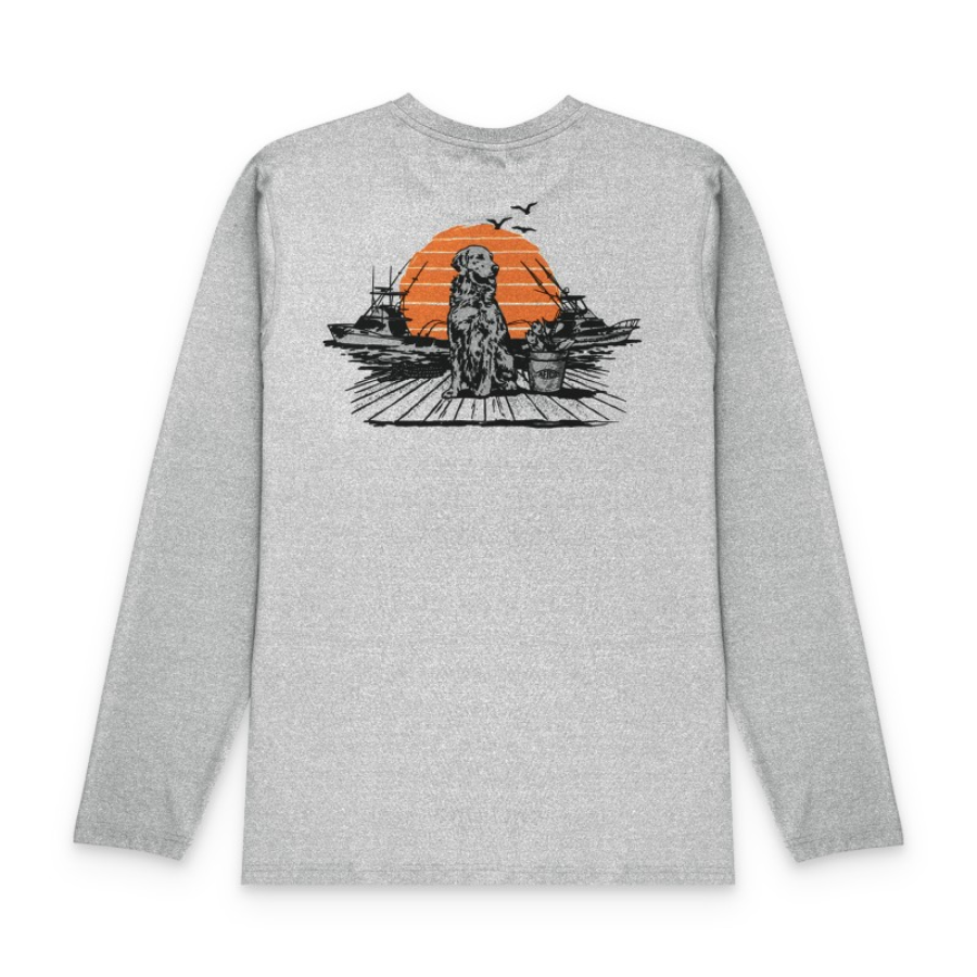 The Bucket long sleeve fishing shirt captures the essence of a day on the water with a Labrador Retriever sitting dockside. This performance fishing shirt is quick-drying and moisture-wicking to maximize comfort. It’s made from REPREVE Our Ocean fabric, which recycles ocean-bound plastic bottles and offers UPF 50 sun protection. With your gear sorted, it’s time to grab your best friend, a bucket of bait, and hit the water\