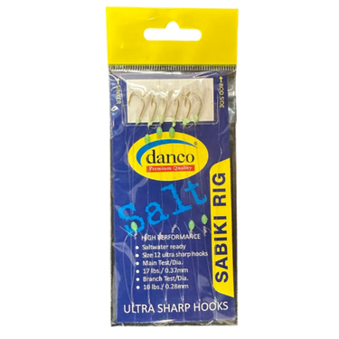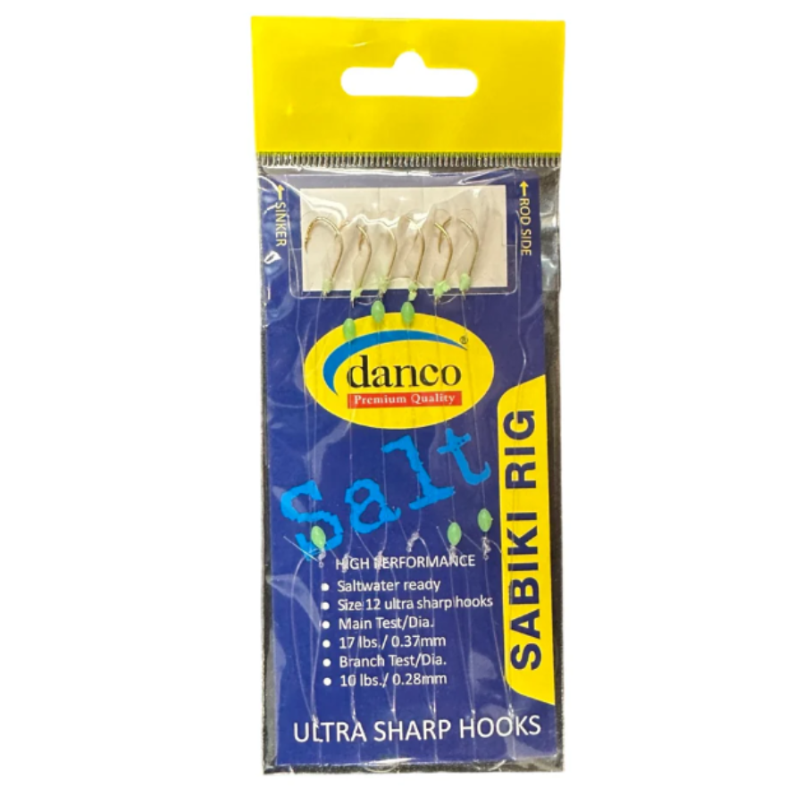The DANCO Goggle Eye Sabiki Rig is designed to maximize your catch when targeting live bait and larger species. Built with bright, super-sharp gold hooks, this rig delivers excellent penetration and holding power. Each hook is paired with a glow bead and reflective fish skin, creating added flash and attraction in both low-light and deep-water conditions to increase strike rates. Constructed with a heavier pound-test monofilament, the rig offers enhanced strength and durability, making it ideal for handling larger baits and aggressive fish. Whether fishing offshore or nearshore, the Danco Goggle Eye Sabiki Rig provides reliable performance, superior visibility, and proven fish-attracting features for consistent success.