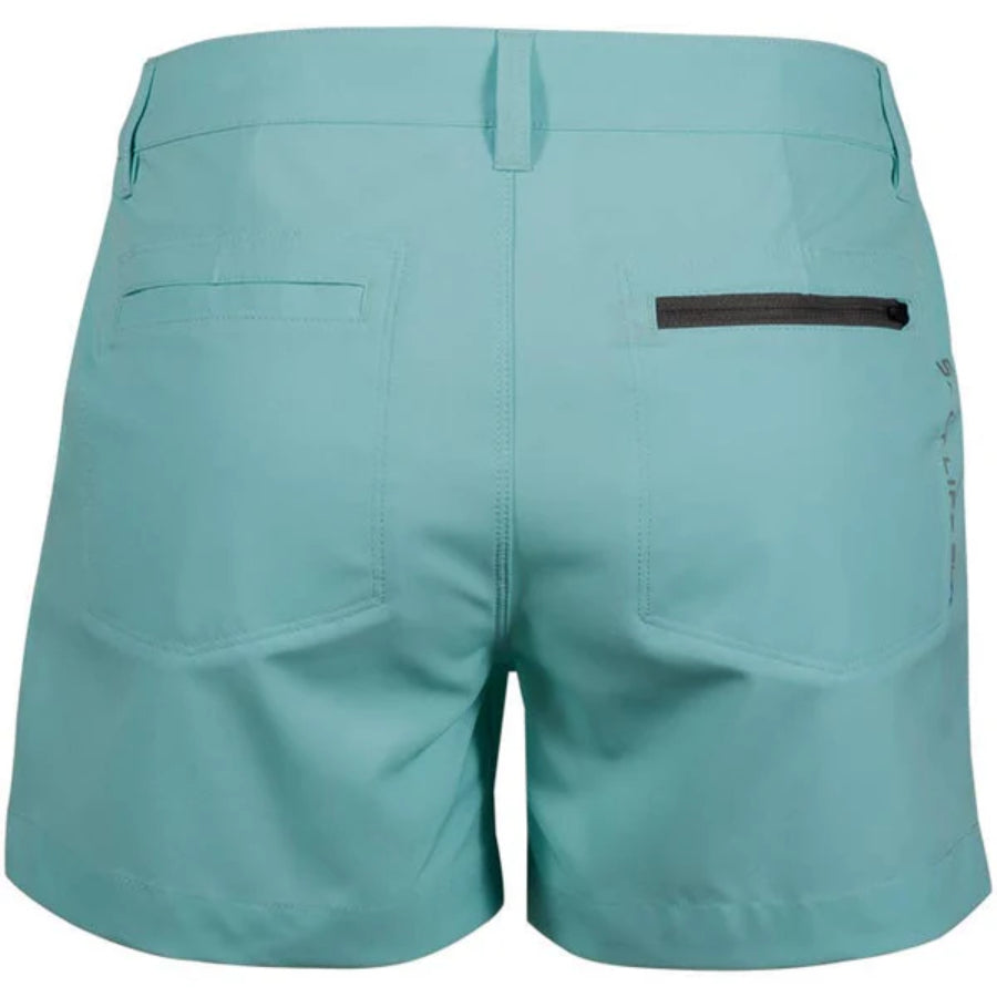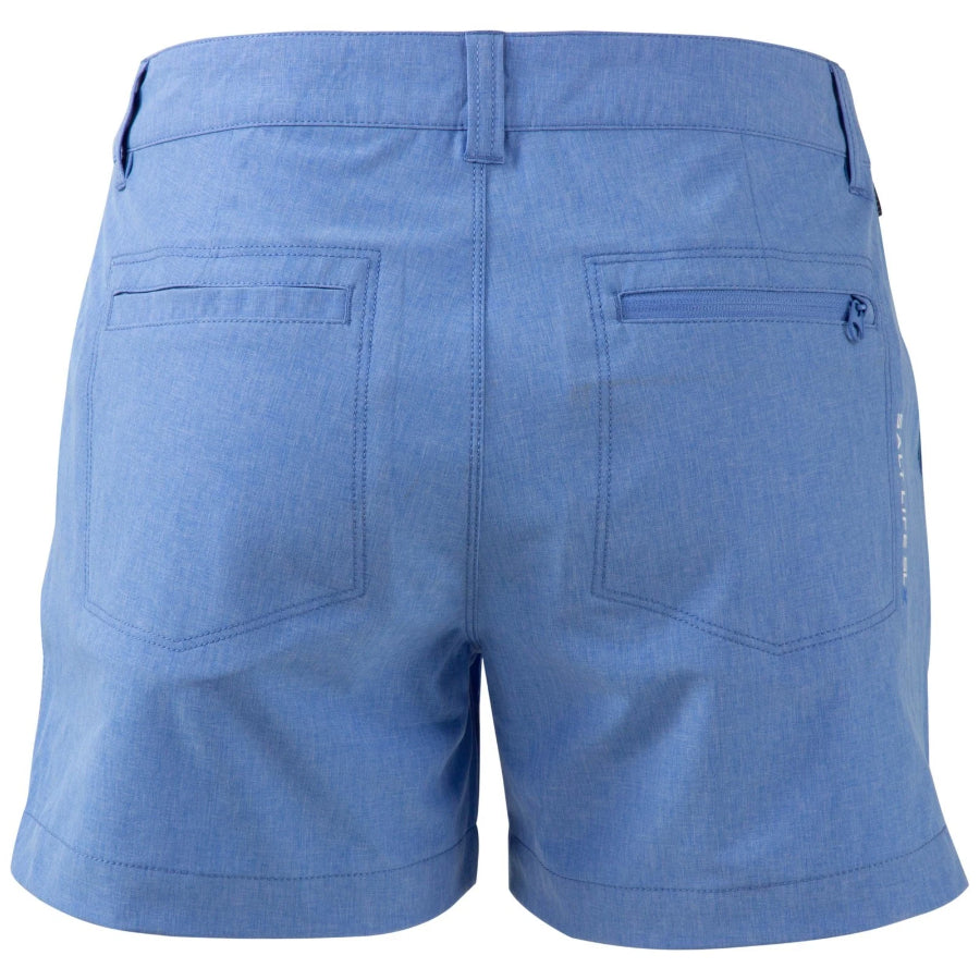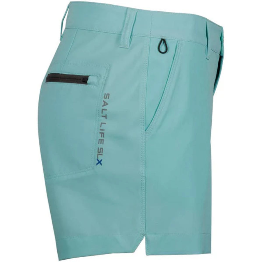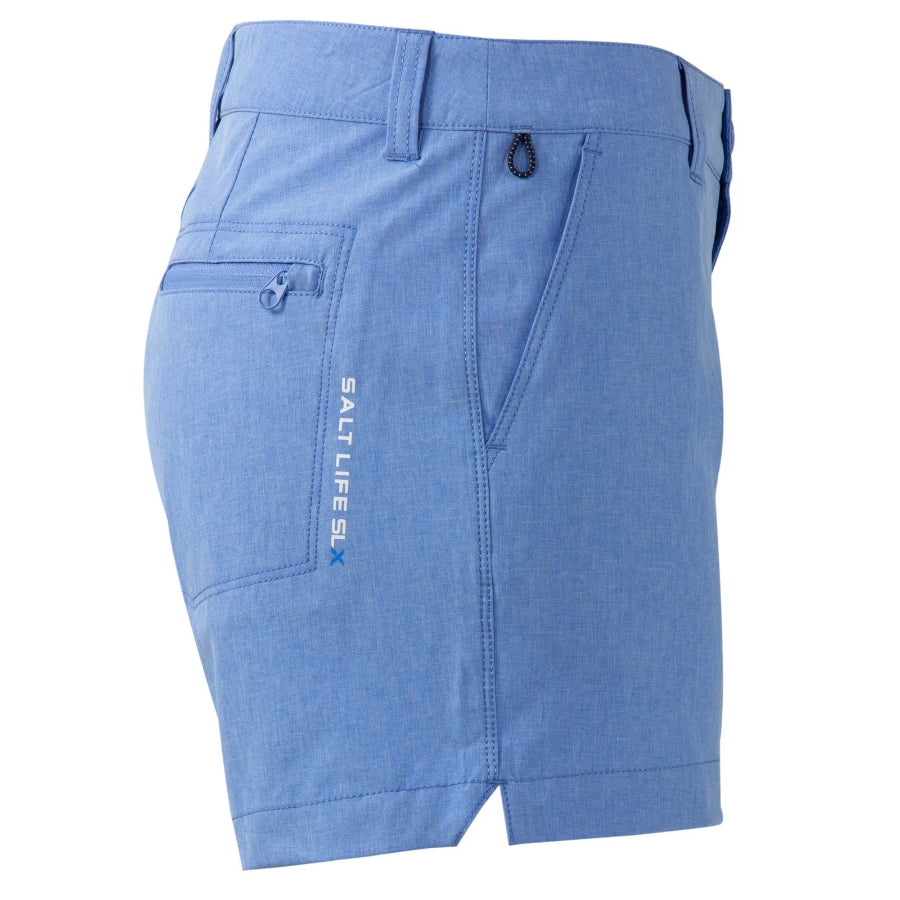 The Transcend ladies' performance fishing shorts are made from SLX QD fabric delivering a comfortable fit with 4-way vapor stretch. Our Salt Life fishing shorts feature front slant pockets, mesh pocket bags and inner waistband, and notched leg slits at the side seams.