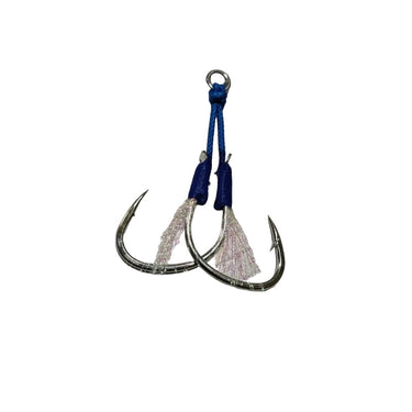 Cerberus double assist hooks are a type of fishing lure designed to increase the hook-up ratio by providing two hooks on a single, strong leader line. Key features include reinforced construction, a durable braided or wired line, a corrosion-resistant coating on the hooks, and a leader length designed to keep the hooks close to the jig.
