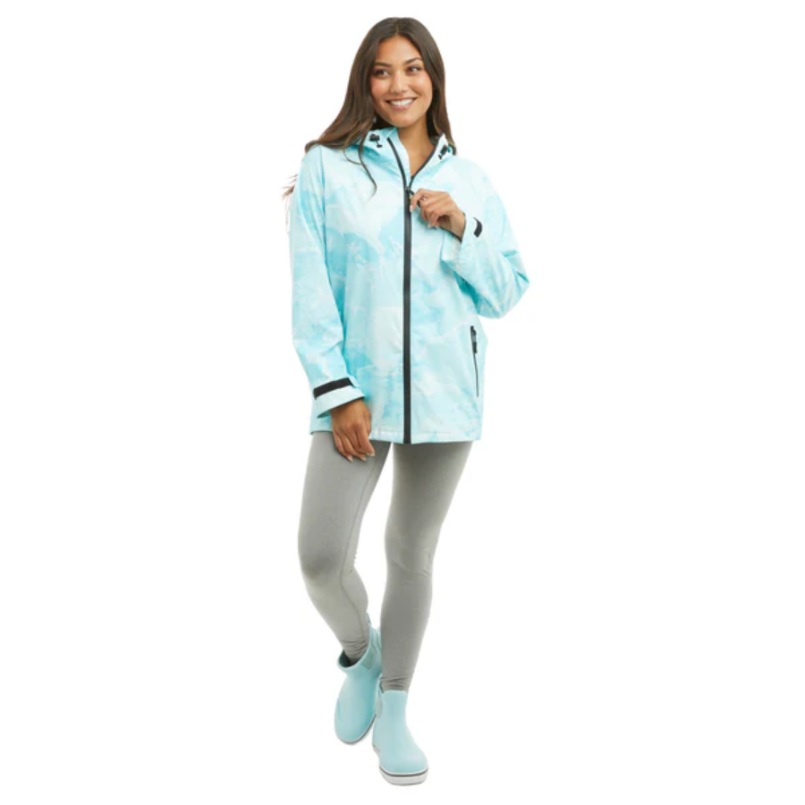 The Chubasco rain jacket is your go-to for foul weather conditions. Constructed with water repellant, 4-way stretch, and 2 layer lightweight PVC that provides all day comfort and packability in wet conditions. This jacket features sealed weather resistant zippers, zipper garages, quick-adjust toggled hood cinch, hood brim and Velcro wrist adjusters. Featuring original Gyotaku art created by Dwight Hwang, this product pays homage to the sea through the traditional method of Japanese fish printing.