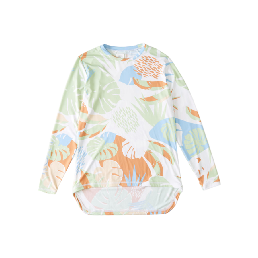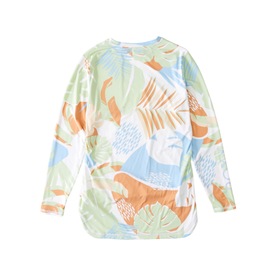 Stay stylish and protected in the Roxy Sea Skippin Long Sleeve Rashguard. Crafted from soft, recycled stretch fabric, this surf top offers UPF 50+ sun protection and a comfortable fitted design. The crew neckline and longer back hem provide extra coverage, while the vibrant tropical print brings a fun, beach-ready vibe. Perfect for surf sessions or sunny days by the water.