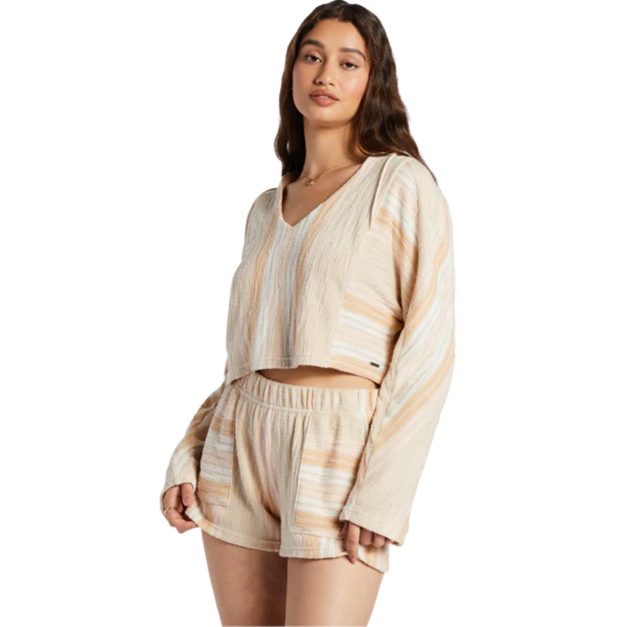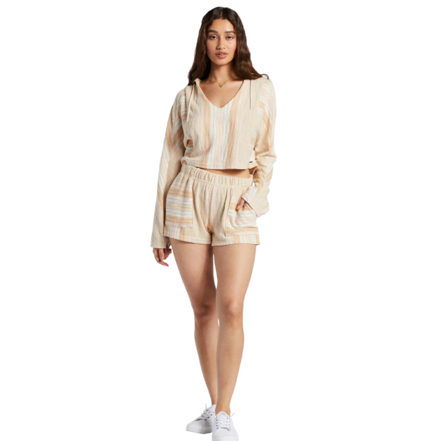 Experience total comfort and style with the ROXY Todos Santos striped hoodie. Crafted from a blend of eco-conscious French Terry fabric, this oversized poncho-style pullover features a V-neck, long sleeves, and an oversized hood.