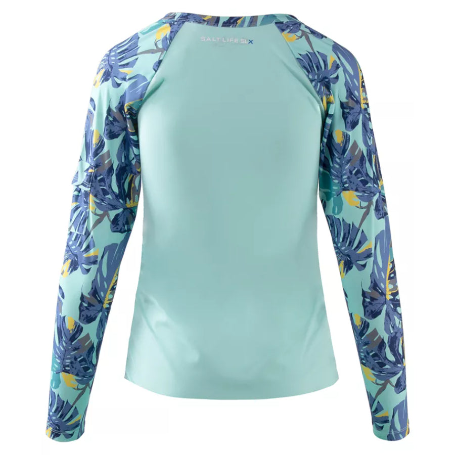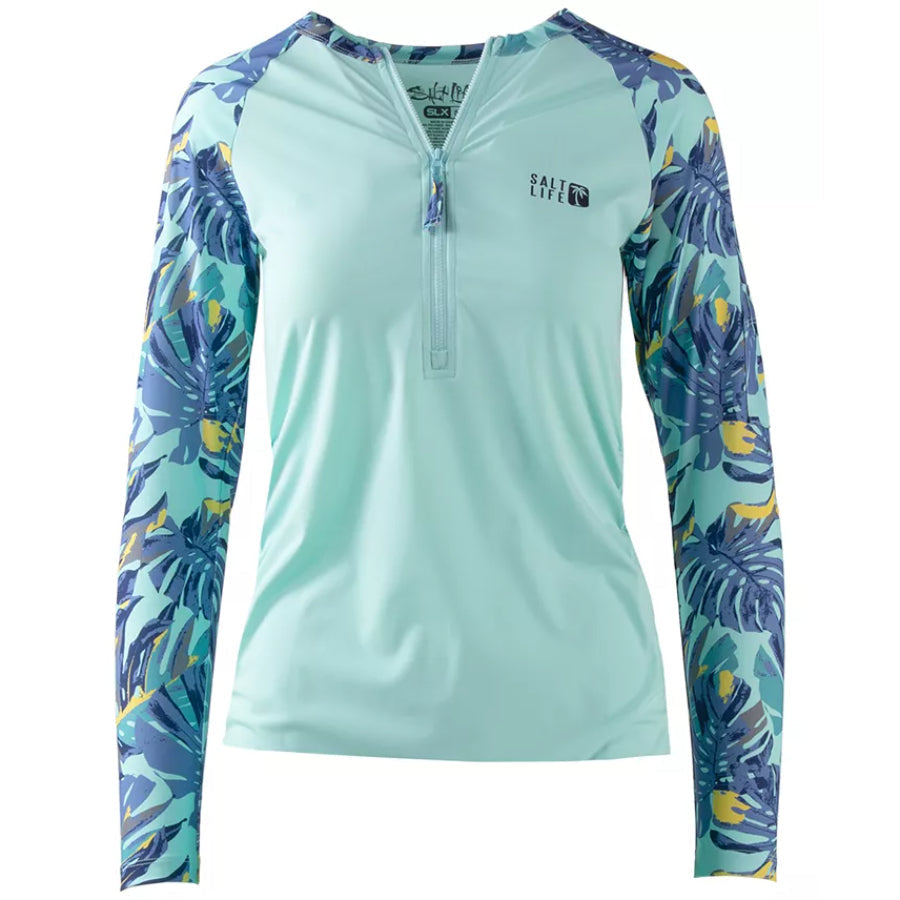 Stay covered and protected from the sun in the Salt Life Loungin' Zip Performance Top. The sleek design features printed long sleeves and moisture-wicking properties with UPF 50 sun protection.