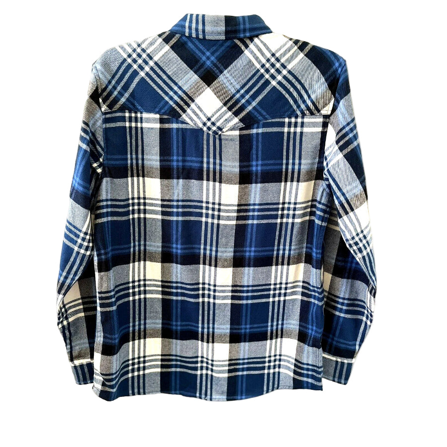 The Daybreak Flannel Shirt in Channel is a long sleeve button-up shirt made from midweight cotton/polyester yarn-dyed check flannel twill with a gently brushed face. It features a two-piece collar and branded resin buttons at the centre front.