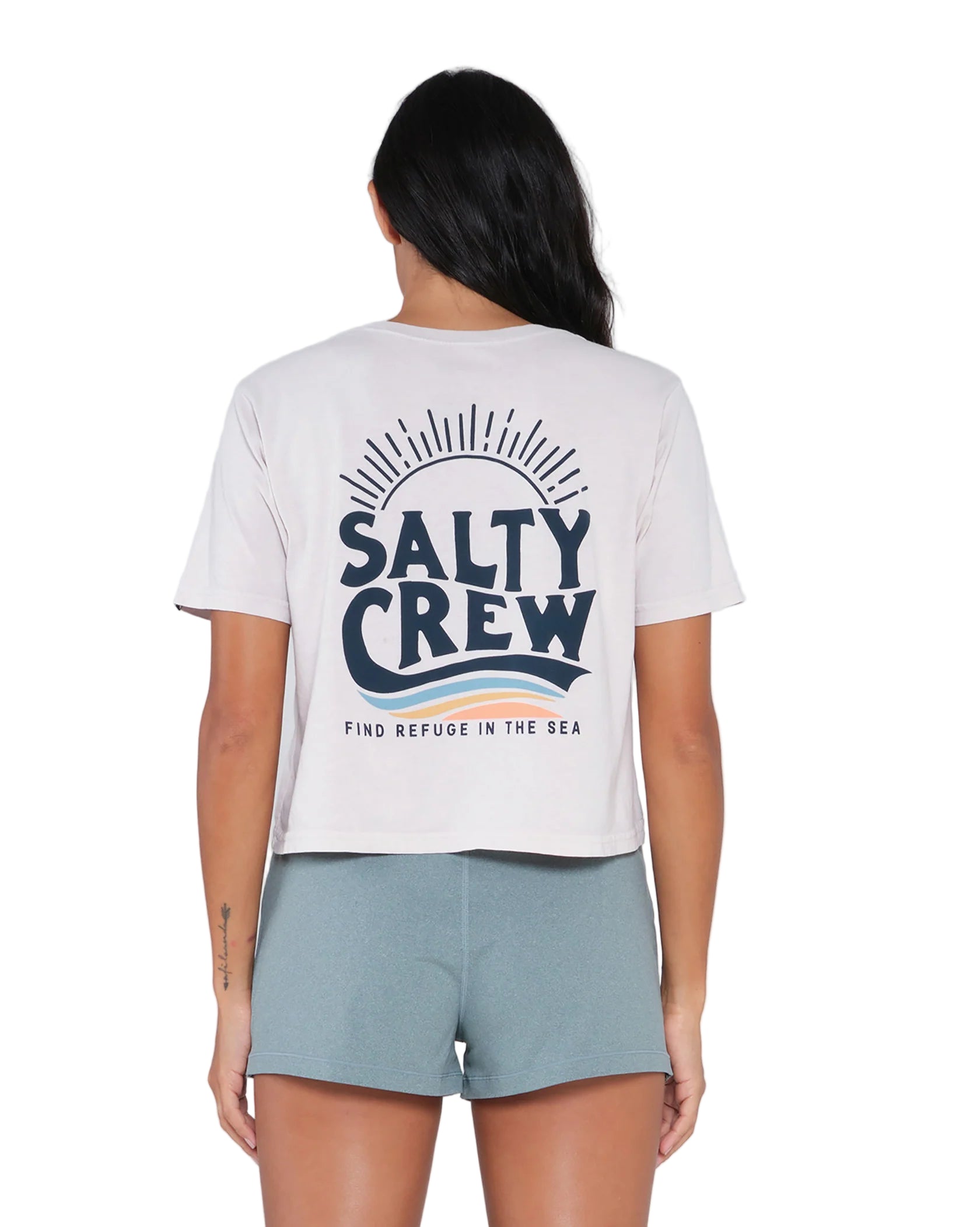The Wave Crop Tee is a Crop Boyfriend Tee featuring soft vintage washed jersey, cropped boxy fit, Screen print at front chest and back body and Salty Crew clamp label at sleeve.