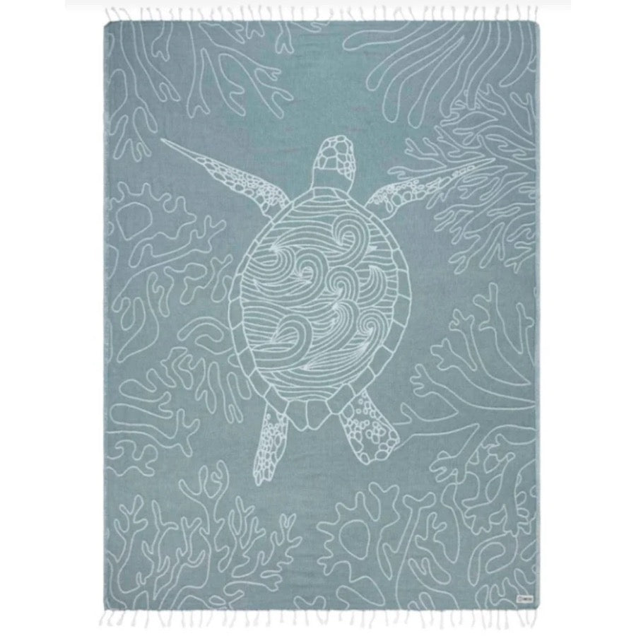 Sea turtle design, made from Turkish organic cotton for a softer hand feel and a better sustainable product, double jacquard weave, twisted tassels, quick dry and sand resistant.