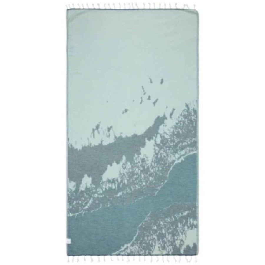 Sunset Beach design, made from Turkish organic cotton for a softer hand feel and a better sustainable product, regular size, jacquard weave, twisted tassels, quick dry and repels sand.