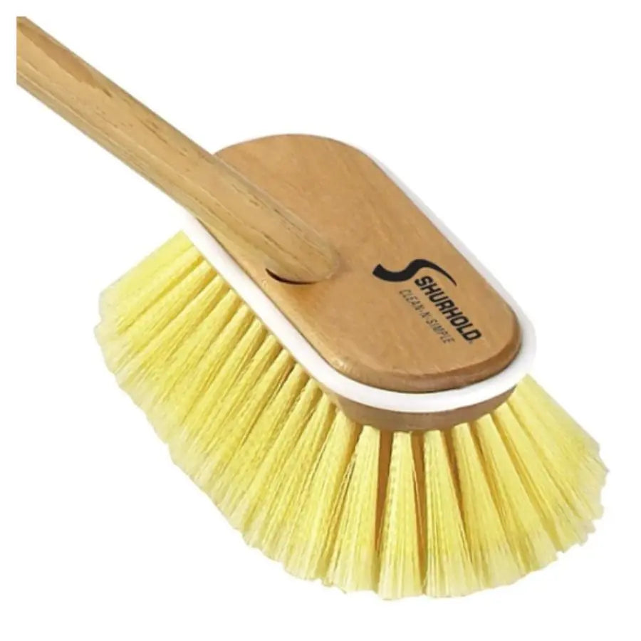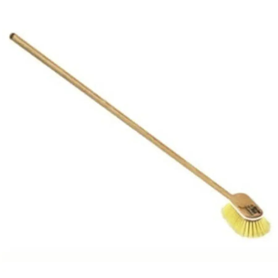 The World's Best Deck Brush...on a stick! The same quality Shurhold Brush on a standard wooden handle. Perfect for under gunnel storage. The popular 6 inch (15 cm) soft brush includes a 48" (122 cm) threaded wood handle. The specially designed split end fibers hold more soap and water and are soft enough to safely use on gelcoat, fiberglass, and painted surfaces.