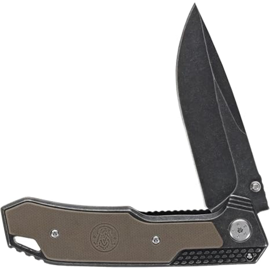 The Smith & Wesson® Liner Lock Fold Knife is designed with a stonewashed high carbon stainless steel drop point blade. It features ambidextrous thumb knobs, thumb rest jimping, and an index flipper. The handle is also stonewashed stainless-steel with brown textured G-10 insert. Included is a lanyard hole and pocket clip.
