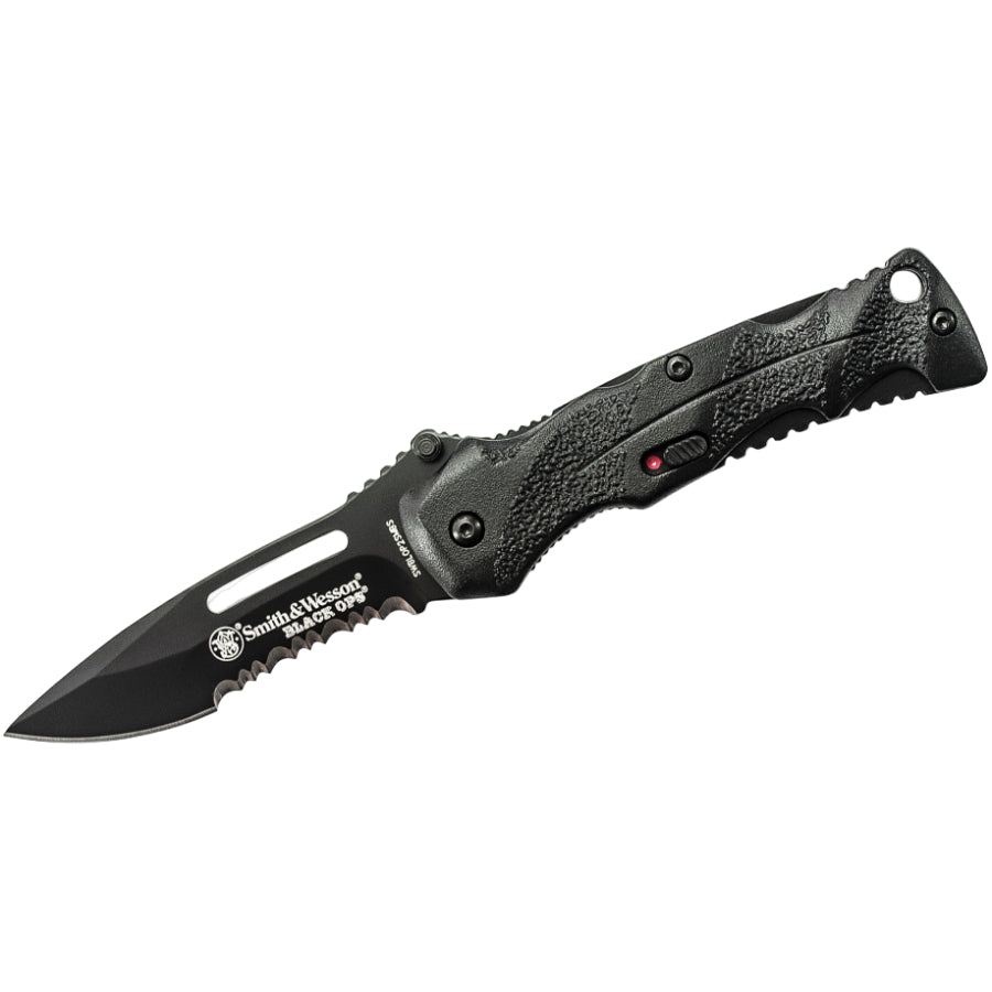 The Smith & Wesson® Black Ops M.A.G.I.C.® Assisted Opening Liner Lock Folding Knife is made from a black stainless-steel tanto blade with ambidextrous thumb knobs, jimping, and blood groove. Its ergonomic rippled and smooth grey aluminum handle comes with a safety lock, lanyard hole, and pocket clip.